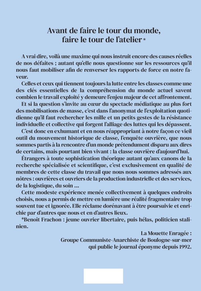 C’est donc en exhumant et en nous réappropriant à notre façon ce vieil outil du mouvement historique de classe, l’enquête ouvrière, que nous sommes partis à la rencontre d’un monde prétendument disparu aux dires de certains, mais pourtant bien vivant : la classe ouvrière d’aujourd’hui.