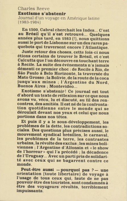 Exotisme s’abstenir , Journal d’un voyage en Amérique latine (1983-1984) – Charles Reeve 1985, 196 pages, 13 euros Partager: Partager sur X(ouvre dans une nouvelle fenêtre) X Partager sur Facebook(ouvre dans une nouvelle fenêtre) Facebook J’aime chargement…