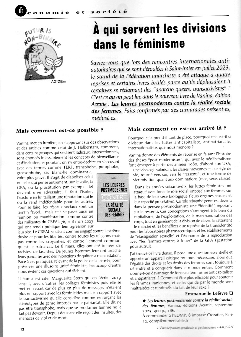 « À l’égal de toutes les féministes universalistes, Vanina récuse le néoféminisme queer et intersectionnel qui considère le sexe biologique comme aléatoire et modifiable à souhait ; au contraire : “Rappeler l’existence de ce sexe n’est donc en rien défendre un point de vue essentialiste ou chercher à discriminer les trans(femmes) » (p. 313). Car c’est bien « En raison de leur sexe biologique que la plupart des femmes sont opprimées et doublement exploitées dans les sphères privée et publique” »