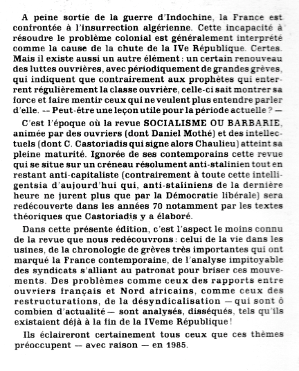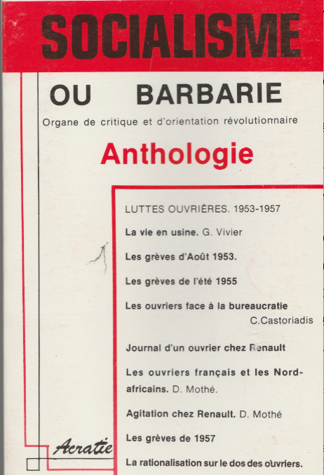 Socialisme ou barbarie (Anthologie) – Chronique des grèves en France (1953 et 1957) 1985 – 320 pages – 15 euros Partager: Cliquer pour partager sur X(ouvre dans une nouvelle fenêtre) X Cliquez pour partager sur Facebook(ouvre dans une nouvelle fenêtre) Facebook J’aime chargement…