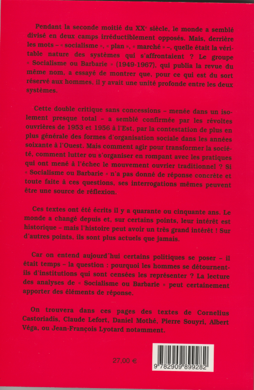 Ce principe n’a cessé d’inspirer le groupe Socialisme ou Barbarie tout au long de son parcours de 1949 à 1967, ainsi que chacun des quarante numéros de la revue du même nom qu’il a publiée. Convaincu de la nécessité de comprendre la réalité pour œuvrer à sa transformation, il a développé une critique radicale des sociétés modernes. Récusant l’alternative entre les deux blocs qui prévalait alors, il s’est efforcé au contraire de mettre en évidence l’unité profonde entre le capitalisme privé de l’Occident et les systèmes bureaucratiques des «Pays de l’Est», sans toutefois, certes, aller jusqu’à prévoir leur descendance actuelle, mélange de nationalisme et de dérive mafieuse. Les révoltes ouvrières et antibureaucratiques, dans les pays de l’Est, en 1953 et 1956, ignorées ou calomniées ailleurs, ont été placées au centre de ses réflexions.